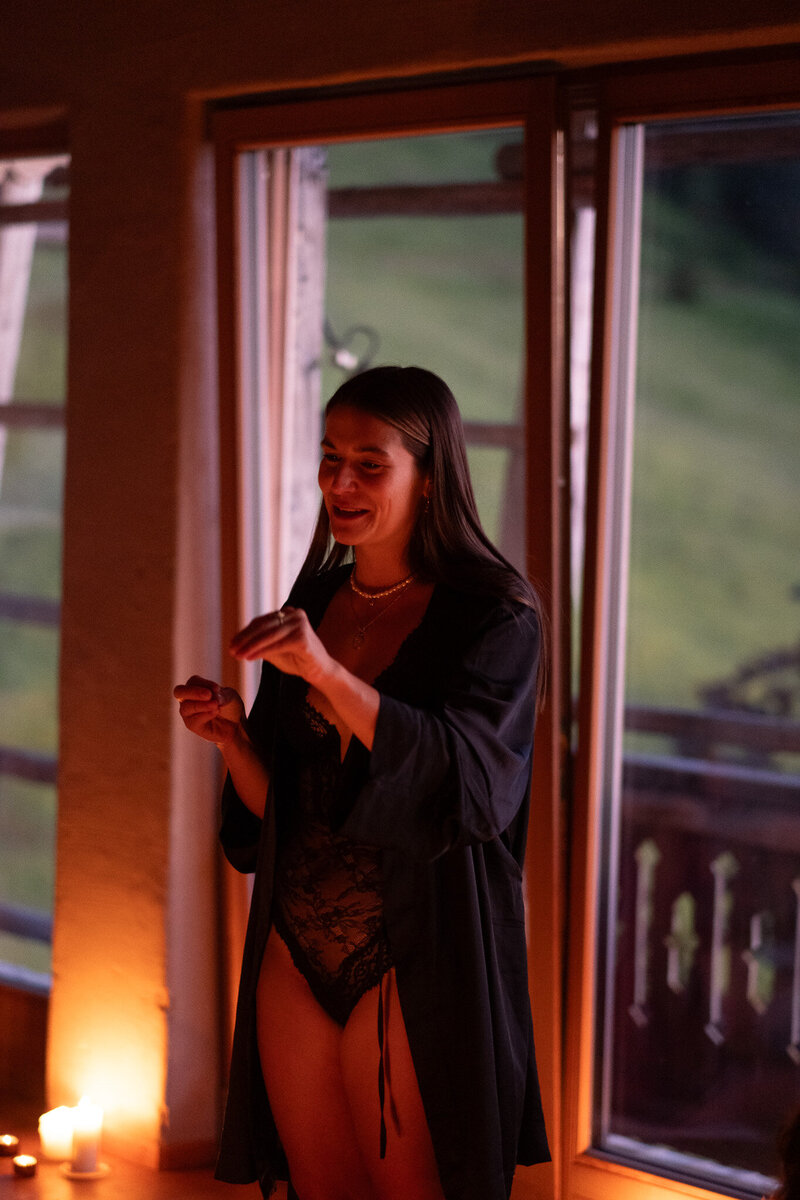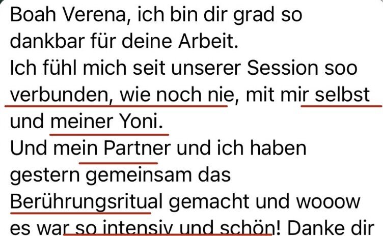 "Ich kam mit wenig Körpergefühl und ohne wirklichen Zugang zu meiner Yoni ins Retreat. Jetzt fühle ich mich frei und kann mich wirklich spüren! Ich habe meine Scham abgelegt und meine Komfortzone immer wieder verlassen. Es war eine kraftvolle, sinnliche Reise in meine Weiblichkeit und ein Gefühl von tiefer Ruhe und Dankbarkeit bleibt in mir.